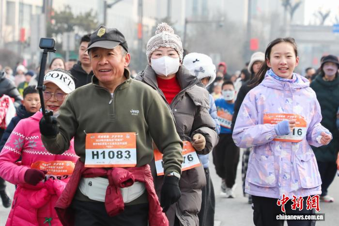 1月1日,青海西宁,一名跑者记录比赛过程。当日,2026年西宁地区第五十三届元旦环城赛鸣枪开跑,8000名运动爱好者赛跑迎接新年第一天。中新社记者 马铭言 摄