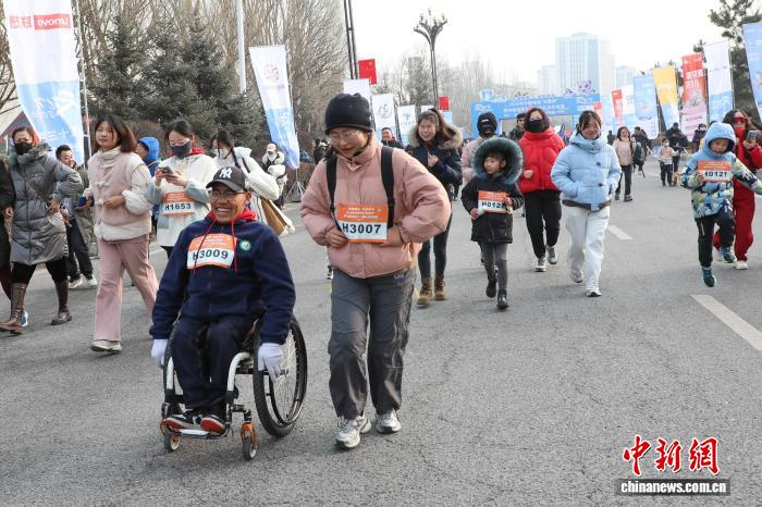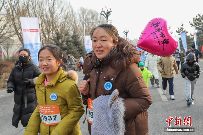 1月1日,青海西宁,一对母女跑步迎接新年。当日,2026年西宁地区第五十三届元旦环城赛鸣枪开跑,8000名运动爱好者赛跑迎接新年第一天。中新社记者 马铭言 摄
