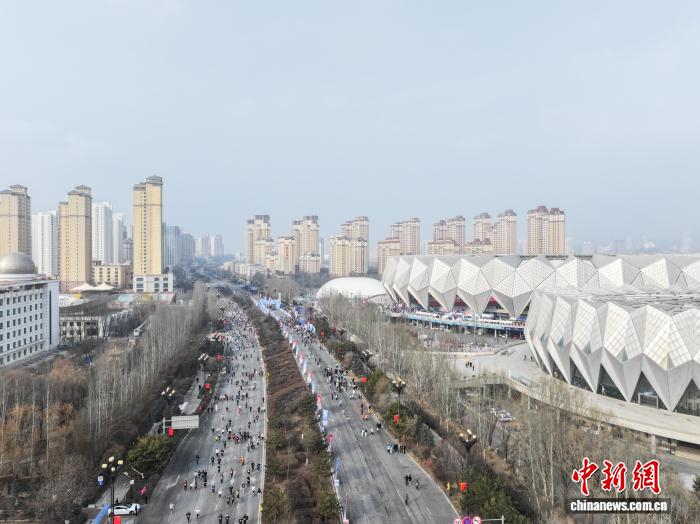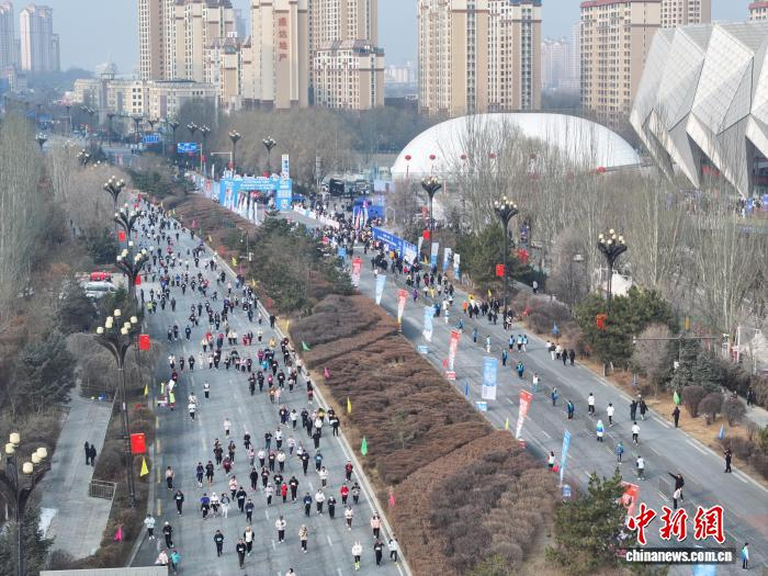 1月1日,青海西宁,跑者赛跑迎新年。当日,2026年西宁地区第五十三届元旦环城赛鸣枪开跑,8000名运动爱好者赛跑迎接新年第一天。(无人机照片)中新社记者 马铭言 摄