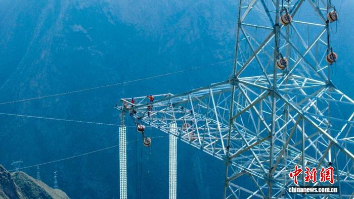 中新网成都1月1日电 (刘忠俊 李萌 高珩瑞)1月1日,四川德阳中江县境内,77米高的N7L035号输电铁塔上,随着牵引走板将最后一相导线牵引至锚线点,四川阿坝——成都东1000千伏特高压交流输电工程(以下简称“阿坝—成都东特高压工程”)首个标段顺利贯通。