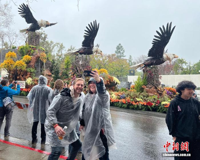 当地时间1月1日,第137届玫瑰花车游行在美国加利福尼亚州帕萨迪纳市举行,人们在雨中迎接新年的到来。图为人们同美国建国250周年主题花车合影留念。 中新社记者 张朔 摄