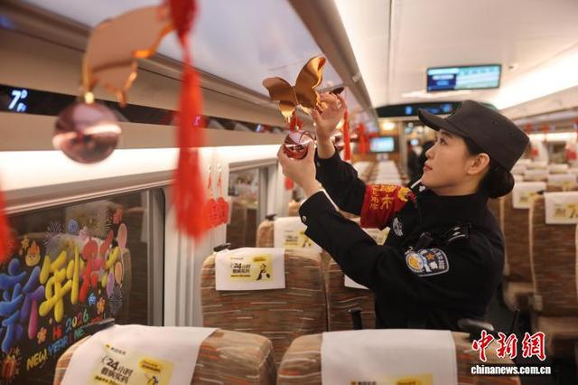 图为乘警李颖在G2026次列车上协助客运人员装饰车厢。张鑫 摄