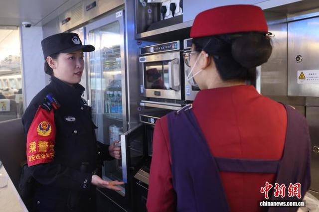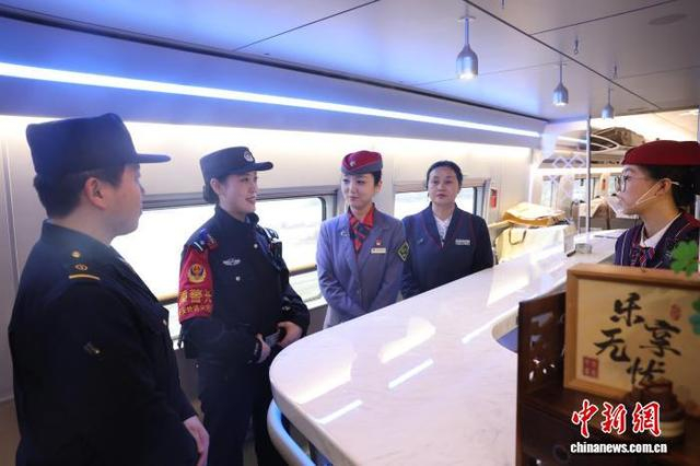 图为乘警李颖在G2026次列车上与相关部门人员做好平安列车五位一体工作。张鑫 摄