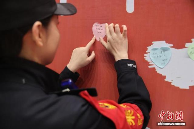 图为乘警李颖在出乘前来到车站的新年愿望打卡墙上写上自己的新年愿望。张鑫 摄