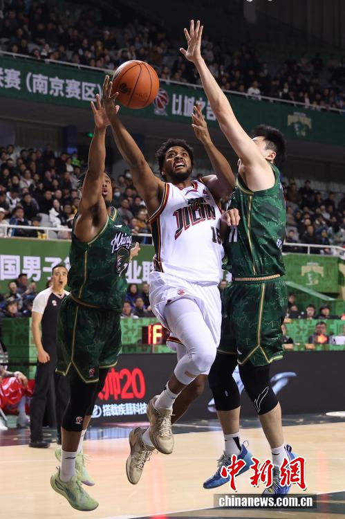 1月2日晚,在江苏南京举行的2025-2026赛季中国男子篮球职业联赛(CBA)常规赛比赛中,南京天之蓝队(绿衣)主场104比82战胜长白山恩都里队(白衣)。图为长白山恩都里队球员盖利(中)在比赛中投篮受阻。中新社记者 泱波 摄