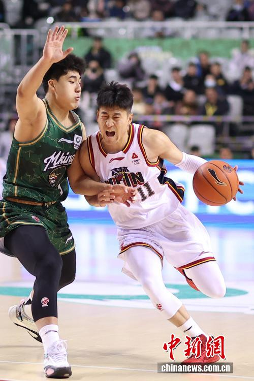 1月2日晚,在江苏南京举行的2025-2026赛季中国男子篮球职业联赛(CBA)常规赛比赛中,南京天之蓝队(绿衣)主场104比82战胜长白山恩都里队(白衣)。图为长白山恩都里队球员姜伟泽(右)在比赛中进攻。中新社记者 泱波 摄