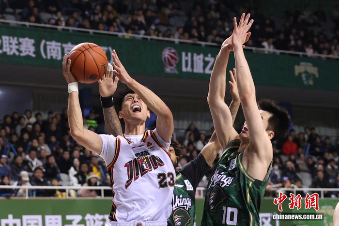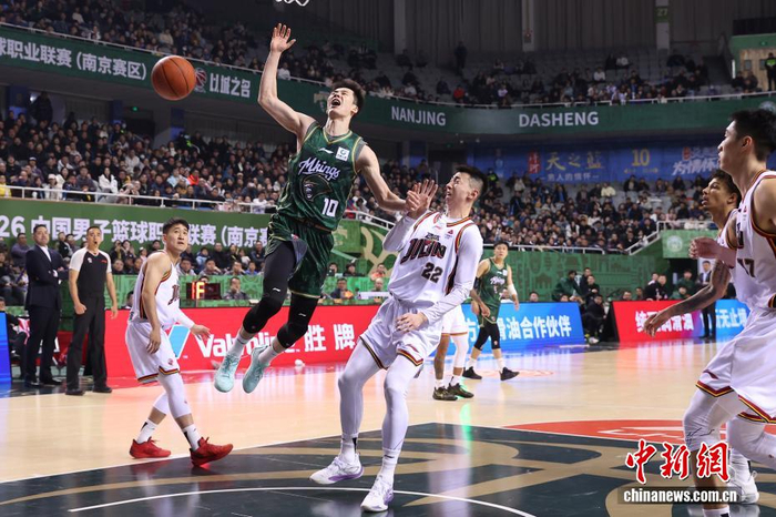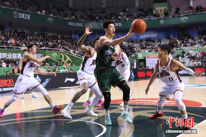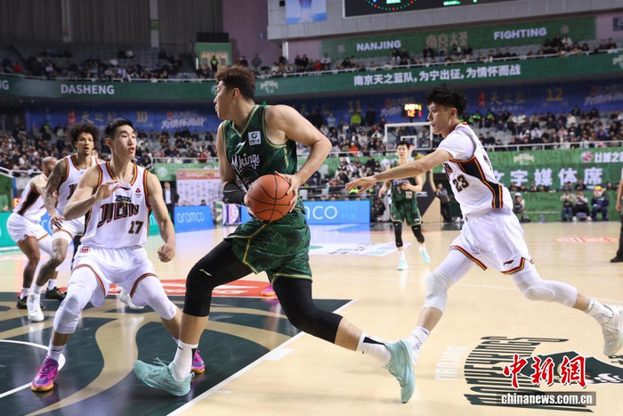 1月2日晚,在江苏南京举行的2025-2026赛季中国男子篮球职业联赛(CBA)常规赛比赛中,南京天之蓝队(绿衣)主场104比82战胜长白山恩都里队(白衣)。图为南京天之蓝队球员马鑫鑫(右二)在比赛中进攻。中新社记者 泱波 摄