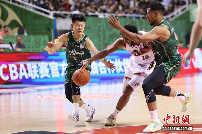 1月2日晚,在江苏南京举行的2025-2026赛季中国男子篮球职业联赛(CBA)常规赛比赛中,南京天之蓝队(绿衣)主场104比82战胜长白山恩都里队(白衣)。图为南京天之蓝队球员郭昊文(左二)在比赛中进攻受阻。中新社记者 泱波 摄