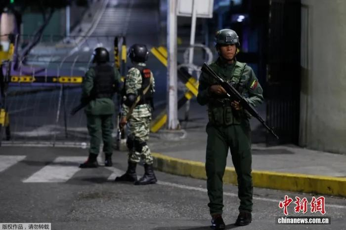 图为当地时间1月3日,委内瑞拉首都加拉加斯发生爆炸后,士兵们在总统府周围警戒。美国对委内瑞拉军事威胁和打击时间线