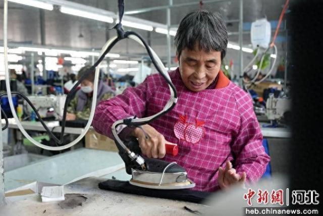 图为在河北省隆尧县双碑乡双碑村,一家制衣厂内一名工人正在熨烫裤腰。 王雪 摄“以前出门打工,一年到头也回不了几次家,老人孩子都照顾不上。现在在家门口上班,一个月能挣三千多块,活儿不累还稳定,日子越来越有奔头了。”张芳笑着说,“自从来到这上班,家里的经济条件改善了不少,生活也越来越红火。”