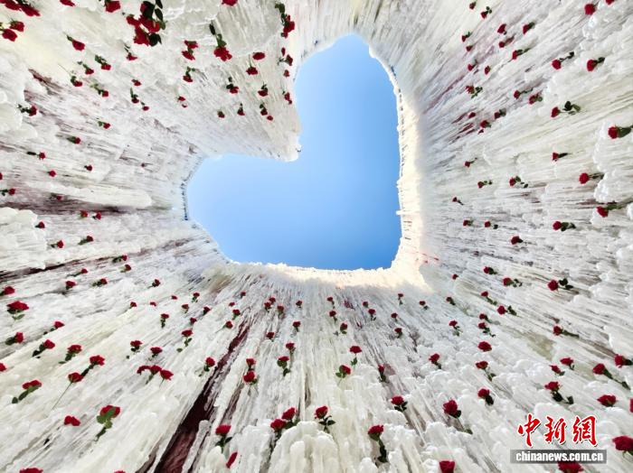 图为“冰玫瑰瀑布”顶部呈心形。 冯丽丽 摄走进占地25万平方米的园区,最引人注目的并非传统的冰雕,而是一面层层堆叠的纯白冰瀑。与普通冰瀑不同,这里将大量炽红的玫瑰花封冻于透明的冰层之中,仿佛鲜花从冰岩褶皱中生长而出。这种强烈的色彩反差营造出的“冰封浪漫”,吸引了众多游客打卡。
