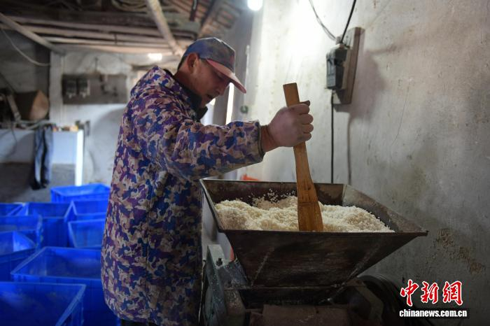 1月8日,在安徽省宣城市旌德县蔡家桥镇朱旺村,年糕加工坊老板正在磨粉,这是制作年糕的步骤之一。中新社记者 储玮玮 摄