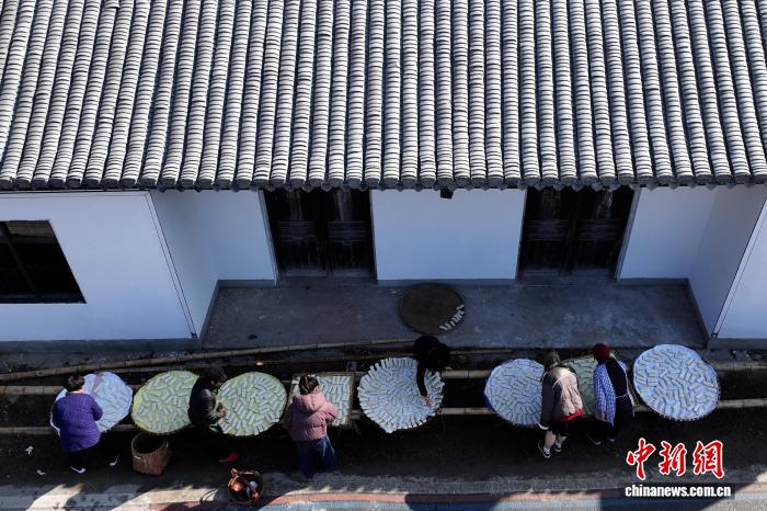 1月8日,在安徽省宣城市旌德县蔡家桥镇朱旺村,村民在晾晒加工好的年糕。中新社记者 储玮玮 摄