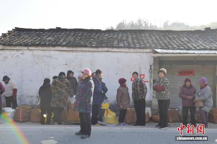 1月8日,在安徽省宣城市旌德县蔡家桥镇朱旺村,村民在排队加工年糕。中新社记者 储玮玮 摄