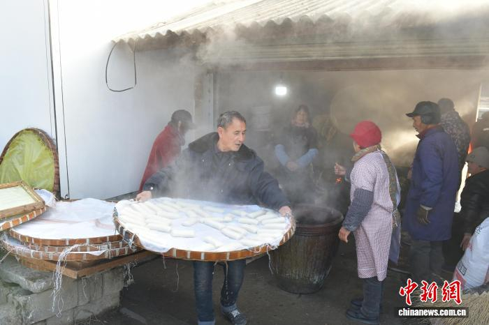 1月8日,在安徽省宣城市旌德县蔡家桥镇朱旺村,一家年糕加工坊内正在蒸制年糕。中新社记者 储玮玮 摄