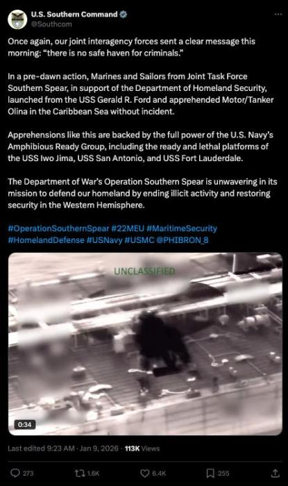 2026年1月9日,美国南方司令部确认,美军与美国国土安全部在一次联合行动中,在加勒比海控制并扣押“奥利娜”号油轮。
