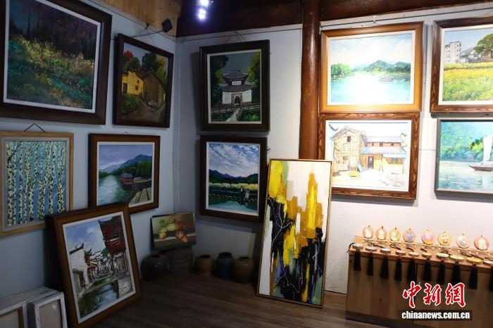 古堰画乡街边小店内陈列的油画作品。黄彦君 摄走进“九九行画”共富工坊工作室,绘制完成的古典山水画、抽象装饰画等有序排列;画师们专注临摹或创作,行画生产流水线高效运转。这正是古堰画乡油画艺术产业化的缩影。