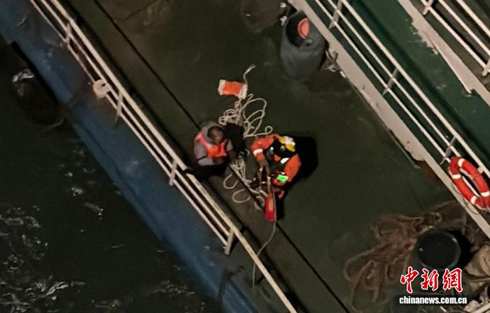 图为救援现场。秦俊超 摄当日1时28分,两架救助直升机飞往事发海域。现场风力10级至11级,浪高3米至5米。飞行员在暗夜环境中依靠仪表、夜视仪和搜索灯,操纵直升机悬停于遇险船舶上空,绞车手精准操纵机载绞车设备,救生员克服强风扰动等困难,分批次展开救援。