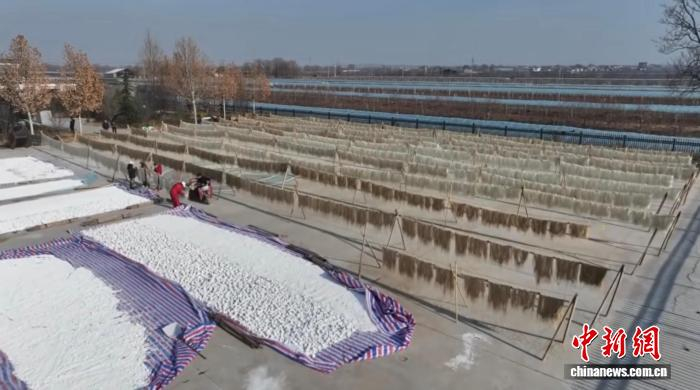 寒冬时节,在山西省万荣县裴庄镇岔门口村的粉条晾晒场上,一排排晶莹剔透的粉条随风摇曳。万荣县融媒体中心供图中新网运城1月10日电(高雨晴 武盈贝 董巨星)寒冬时节,在山西省万荣县裴庄镇岔门口村的粉条晾晒场上,一排排晶莹剔透的粉条随风摇曳。当地依托黄河滩涂优质红薯资源,将传统粉条进行加工,做成了带动群众增收致富的大产业。