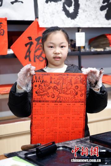 1月10日,浙江杭州一家沉浸式非遗体验空间内,游人体验皮影戏、花灯等年味非遗文创。图为游人展示拓印出的新年日历。中新社记者 肖健 摄