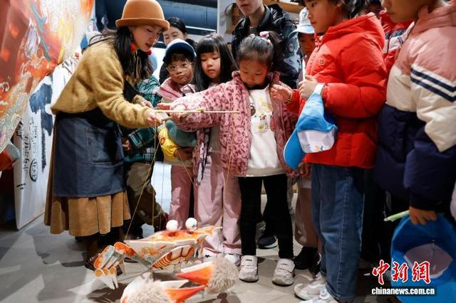 1月10日,浙江杭州一家沉浸式非遗体验空间内,游人体验皮影戏、花灯等年味非遗文创。图为游人赏玩螃蟹形状的花灯。中新社记者 肖健 摄