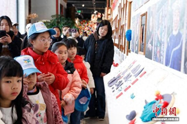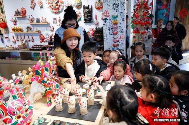 1月10日,浙江杭州一家沉浸式非遗体验空间内,游人体验皮影戏、花灯等年味非遗文创。图为游人观赏泥塑作品。中新社记者 肖健 摄