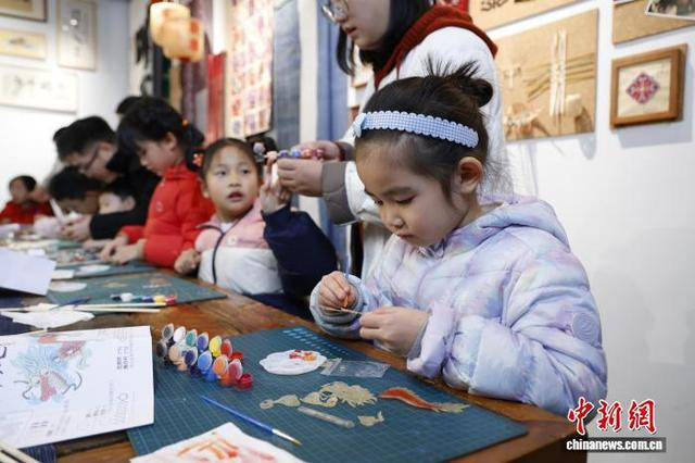1月10日,浙江杭州一家沉浸式非遗体验空间内,游人体验皮影戏、花灯等年味非遗文创。图为游人为皮影戏部件上色。中新社记者 肖健 摄