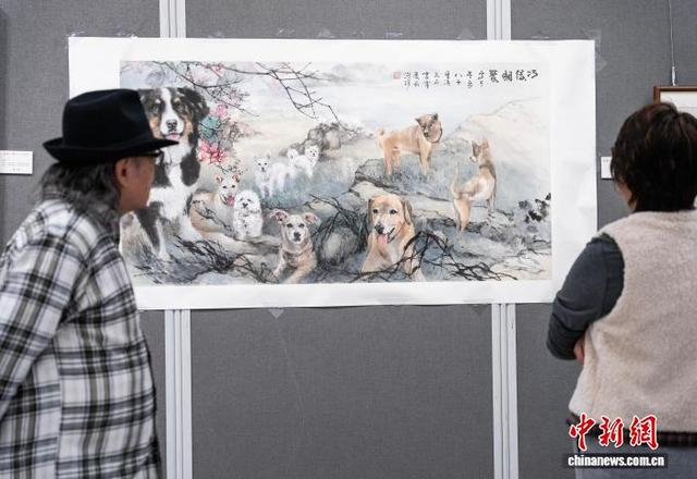 图为观众参观何洵瑶为本次书画展创作的作品《旺旺》。中新网记者 侯宇 摄