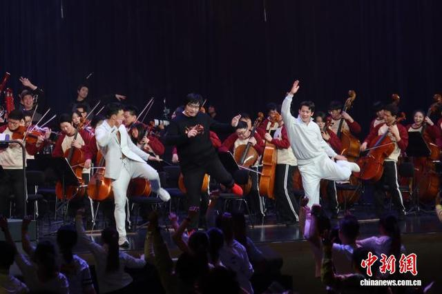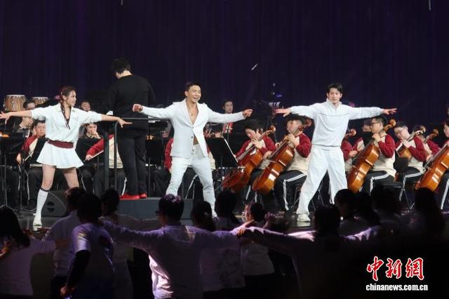 1月10日,刘畊宏与交响乐团同台健身。当日,由嘉兴大潮爱乐乐团与刘畊宏联合打造的“奔潮·乐燃全开”健身交响音乐会在浙江盐官古城-潮乐之城潮城艺术中心举行。此次健身交响音乐会整合音乐、健身、舞蹈三大领域专业力量,打造跨界文化IP。中新社发 孙琳茹 摄