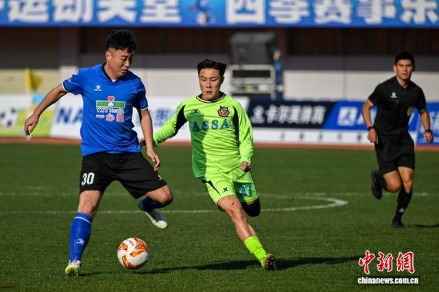 1月10日,“滇港同心,助力滇超——2026滇港友谊赛”在云南省昆明市举行,经过激烈角逐,香港明星足球队和昆明明星足球队最终比分为3:4。图为香港明星足球队(绿衣)与昆明明星足球队在比赛中抢球。中新社记者 李嘉娴 摄