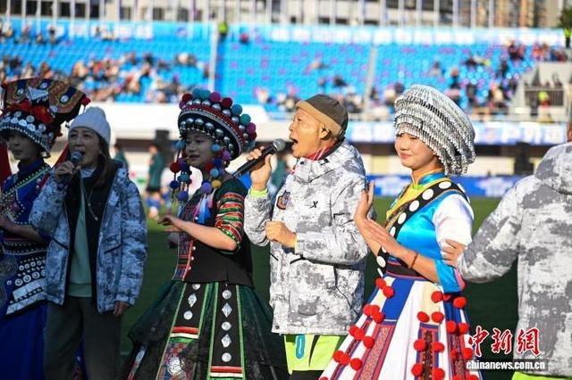 1月10日,“滇港同心,助力滇超——2026滇港友谊赛”在云南省昆明市举行,经过激烈角逐,香港明星足球队和昆明明星足球队最终比分为3:4。图为罗家英(右二)、马海伦(左二)等在休息环节演唱《万水千山总是情》。中新社记者 李嘉娴 摄