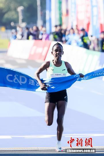 1月11日,2026年厦门马拉松开赛,埃塞俄比亚选手包揽男女组冠军。图为女子组冠军鲁蒂·阿加·索拉冲线瞬间。中新社记者 王东明 摄