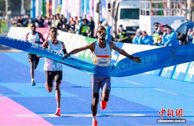 1月11日,2026年厦门马拉松开赛,埃塞俄比亚选手包揽男女组冠军。图为男子组冠军达维特·沃尔德·阿雷加冲线瞬间。中新社记者 王东明 摄
