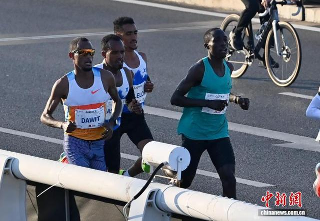 1月11日,2026年厦门马拉松开赛,埃塞俄比亚选手包揽男女组冠军。图为男子组冠军达维特·沃尔德·阿雷加(左一)奔跑在赛道上。中新社记者 王东明 摄