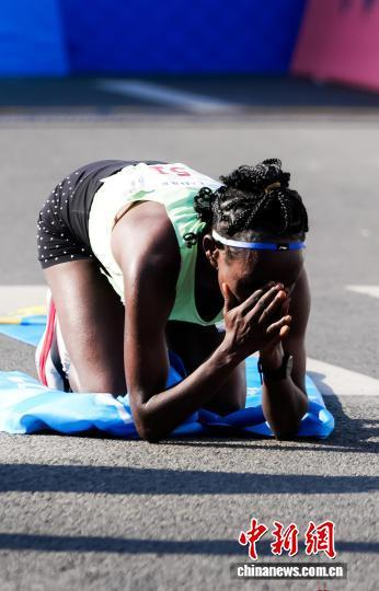 1月11日,2026年厦门马拉松开赛,埃塞俄比亚选手包揽男女组冠军。图为女子组冠军鲁蒂·阿加·索拉冲线后跪地庆祝。中新社记者 王东明 摄