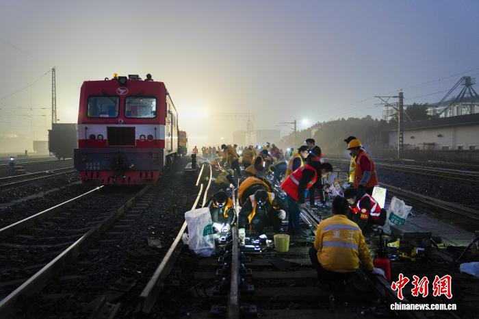 图为集中修现场。中国铁路成都局集团有限公司供图1月11日凌晨4时30分,在重庆兴隆场编组站站场内,作业人员开始对铁路线路、接触网等设备进行综合整治,计划利用40多个“天窗”时段,协调5个专业、组织上千名人员推进施工,为即将到来的运输高峰及全年铁路运输安全畅通打下基础。