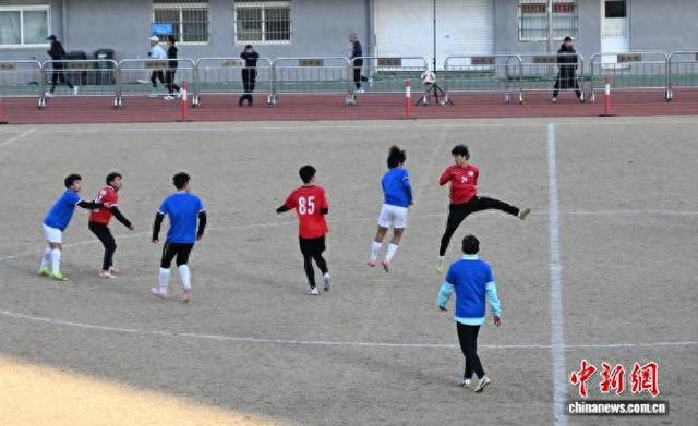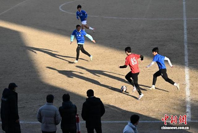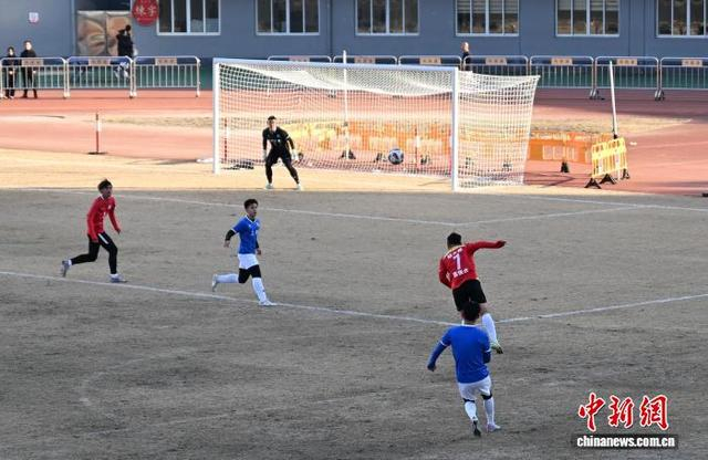 1月11日,上城队队员(蓝衣)和拱墅队队员(红衣)进行热身赛。当日,浙江省杭州市上城区足球队出征仪式在上城区体育中心举行,来自当地的教师、民警、职员等“草根”足球爱好者组成队伍并开展训练,迎战2026杭州城市足球联赛。中新社记者 王刚 摄