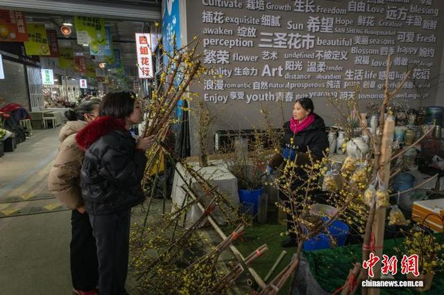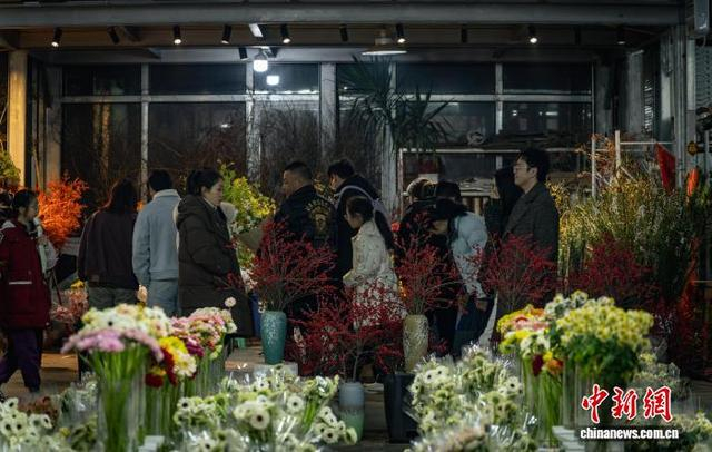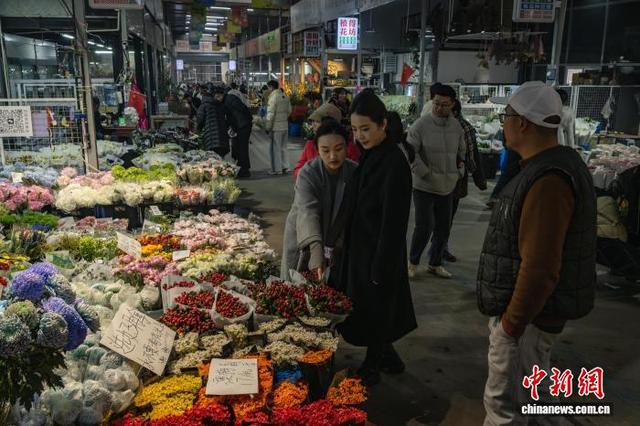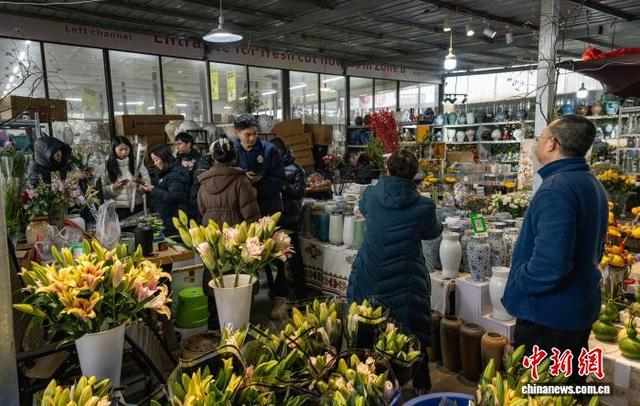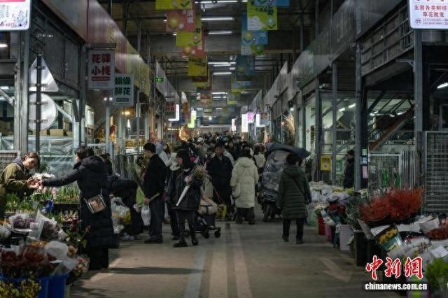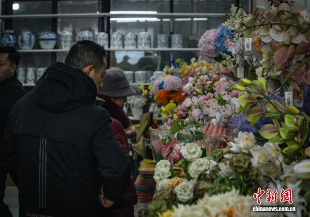 1月11日,成都市锦江区三圣花市一派热闹景象,商铺内各品种花卉琳琅满目,前来选购鲜花的市民络绎不绝。图为花市热闹非凡。韩金雨 摄