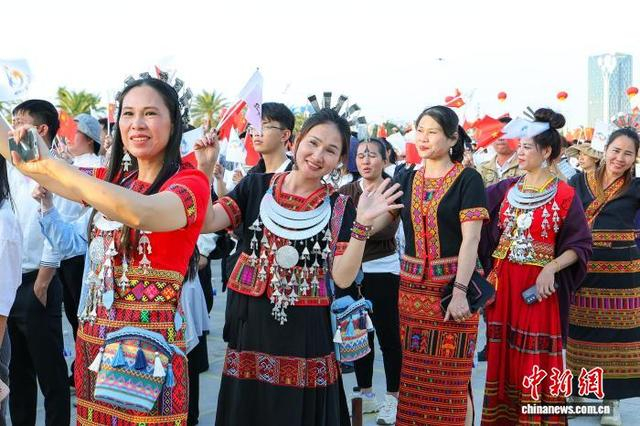 1月12日,第六届亚洲沙滩运动会倒计时100天誓师大会在海南省三亚市举行。图为民众身着黎族传统服饰参加活动。中新社记者 骆云飞 摄