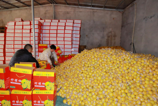 王丽珍正忙着将挑拣好的柠檬柚打包装箱。 付丽玲 摄也是在那一年,她决定承包村集体七百多亩荒山。但接下来数年,山上迟迟未动。直到2015年,她才真正行动起来。