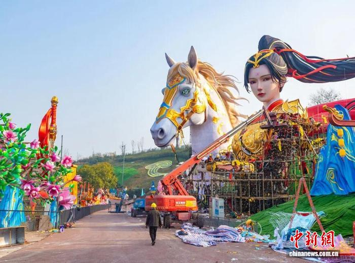 白天施工现场。自贡市融媒体中心 供图据了解,第三十二届自贡国际恐龙灯会以“灯绘华夏 筑梦未来”为主题,强调视觉创新、科技创新,既要充满“年味儿”,又要符合当代审美,将用11组大型灯组、200余组中小型灯组,打造出“中国结大道”“福禄广场”“木兰传奇”“匠心非遗”“神奇华夏”等十大板块,将于本月下旬正式开灯。