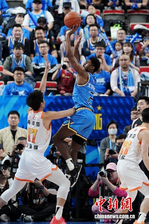 1月13日,在北京首钢园冰球馆举行的2025-2026中国男子篮球职业联赛(CBA)常规赛比赛中,北京北汽队主场89比85战胜江苏肯帝亚队。图为北京北汽队贝利(蓝衣)跳投。中新社记者 张祥毅 摄
