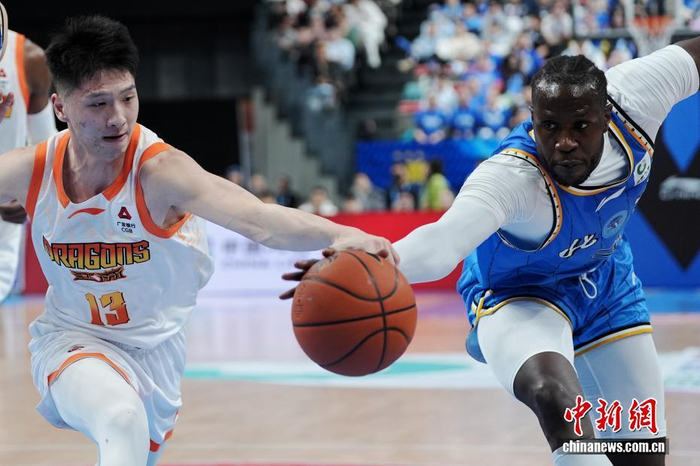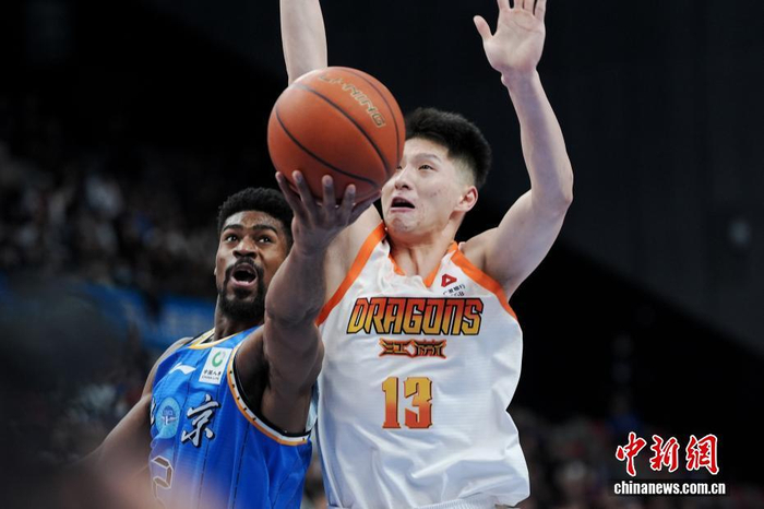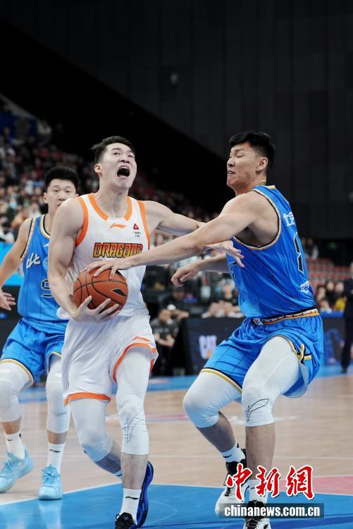 1月13日,在北京首钢园冰球馆举行的2025-2026中国男子篮球职业联赛(CBA)常规赛比赛中,北京北汽队主场89比85战胜江苏肯帝亚队。图为北京北汽队范子铭(蓝衣)防守江苏肯帝亚队刘正清(白衣)的进攻。中新社记者 张祥毅 摄