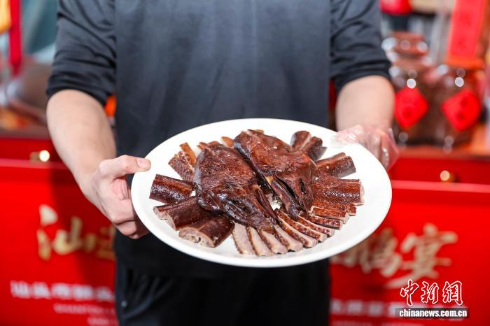 18日汕头卤狮头鹅肉展示。林大森摄据了解,汕头澄海狮头鹅已形成集繁育、养殖、加工、产品销售于一体的完善产业链条,配套建成了涵盖冷链、物流、加工、电商的现代农业体系。全产业链年产值从2022年的45亿元增长至2025年突破100亿元。