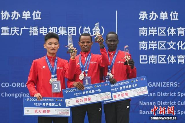 1月18日,2026重庆马拉松在重庆市南岸区南滨路海棠烟雨公园鸣枪起跑,吸引来自26个国家和地区的2.5万名选手参赛,在长江之滨演绎速度与激情。中国选手丰配友以2小时10分22秒的成绩获得亚军,国内男子组第一名,并打破由董国建在2016年重马创造的中国籍赛会纪录。图为丰配友(左一)在颁奖仪式上。中新社记者 何蓬磊 摄