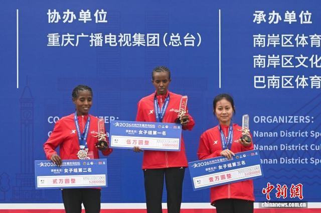 1月18日,2026重庆马拉松在重庆市南岸区南滨路海棠烟雨公园鸣枪起跑,吸引来自26个国家和地区的2.5万名选手参赛,在长江之滨演绎速度与激情。中国选手朱卿以2小时28分53秒的成绩获得季军,国内女子组第一名。图为朱卿(右一)在颁奖仪式上。中新社记者 何蓬磊 摄