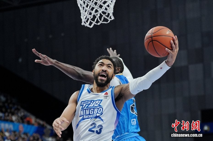 1月18日,在北京首钢园冰球馆举行的2025-2026中国男子篮球职业联赛(CBA)常规赛比赛中,北京北汽队主场94比86战胜宁波町渥队。图为宁波町渥队马丁(白衣)上篮。中新社记者 张祥毅 摄