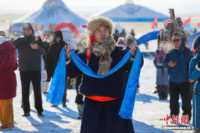 图为丹·道尔吉表演赞马颂。敖特根其木格 摄18日,“歌游内蒙古·畅享锡林浩特”2026年锡林浩特冬季那达慕暨蒙古马超级联赛开幕。开幕仪式上,这场古老而庄重的赞马颂仪式吸引了不少人的目光。丹·道尔吉身着深蓝色蒙古袍,头戴冬皮帽,手捧蓝色哈达,以浑厚苍劲的嗓音唱着赞马颂,并将银碗内的鲜奶依次涂抹于4名骑手的马头上,祝福骑手平安、马群兴旺。