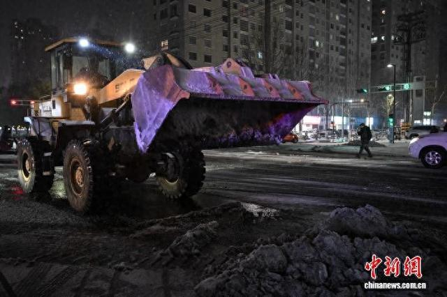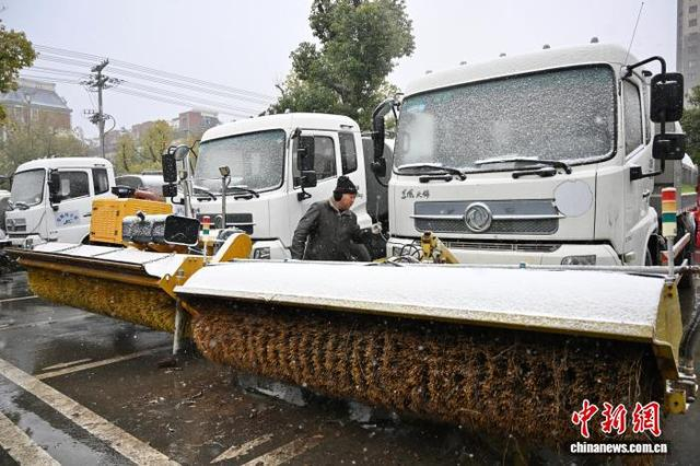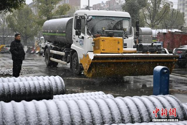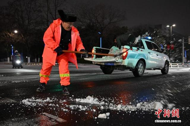 1月19日,安徽省颍上县迎来降雪天气。该县城市管理局组织人员在道路上开展清雪作业,保障民众出行安全。中新社记者 韩苏原 摄