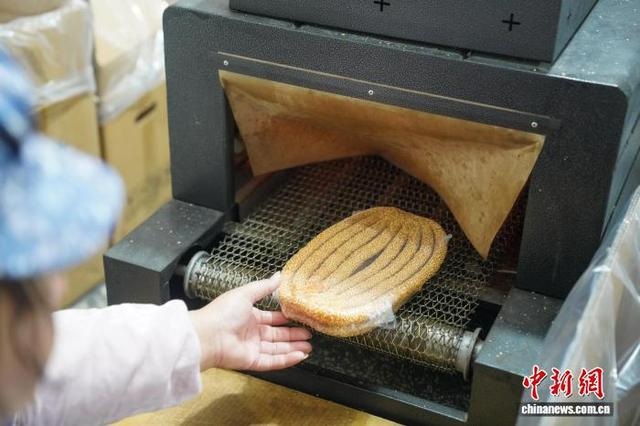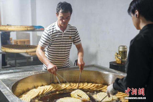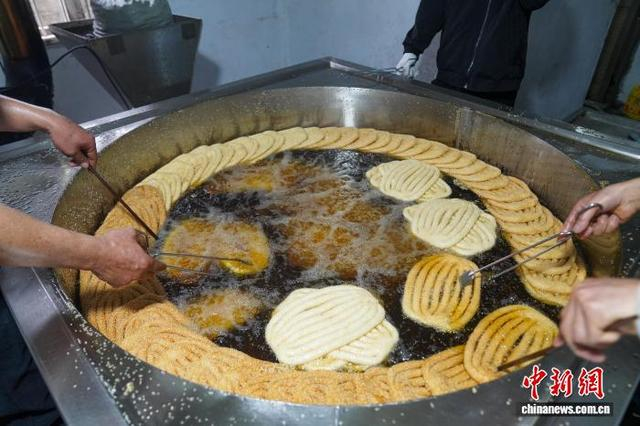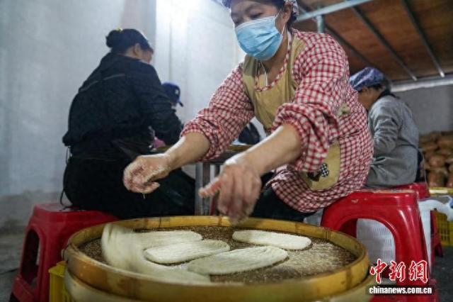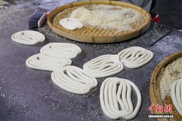 1月19日,广西贺州市富川瑶族自治县的一家粿条厂内,经过十余名工人揉搓、盘绕和油炸,一张张形似草鞋的粿条成型。粿条形似瑶族草鞋,承载着“亲友常走动”的文化寓意,每家每户过年期间都会准备几十斤至上百斤不等的粿条,用于接待或走亲访友,是当地重要的“年味”载体。富川瑶族油炸粿条技艺被列入广西壮族自治区第八批自治区级非物质文化遗产代表性项目名录。图为工人正在制作“草鞋”粿条。王以照 摄